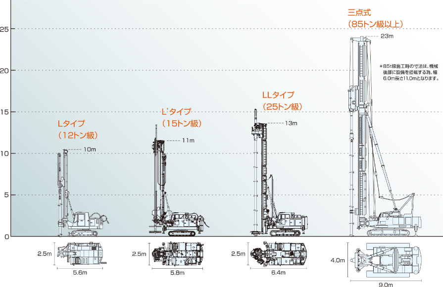 ATTコラム工法は、小型機から大型機までの施工機を用意しており、狭隘地から大型現場まで対応可能です。施工機械は低騒音・低振動タイプであるため、近隣環境にも優しい杭工法です。